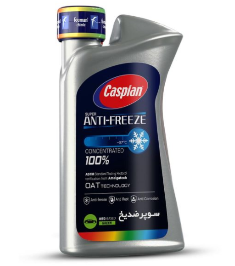 ضدیخ سوپر کاسپین مطابق با استاندارد ۳۳۸ ایران و با فناوری OAT در حداکثر سازگاری با فناوری موتورها و با آبوهوای ایران فرموله شده است و در محدوده دمایی ۳۷- درجه سانتیگراد تا ۱۱۲+ سانتیگراد قابل استفاده است. این ضدیخ غلیظ میباشد و برای دستیابی به مناسبترین محدوده دمایی باید مطابق با جدول مندرج بر روی لیبل ضدیخ با آب دییونیزه (آب رادیاتور کاسپین) و یا آب مقطر رقیق شود.